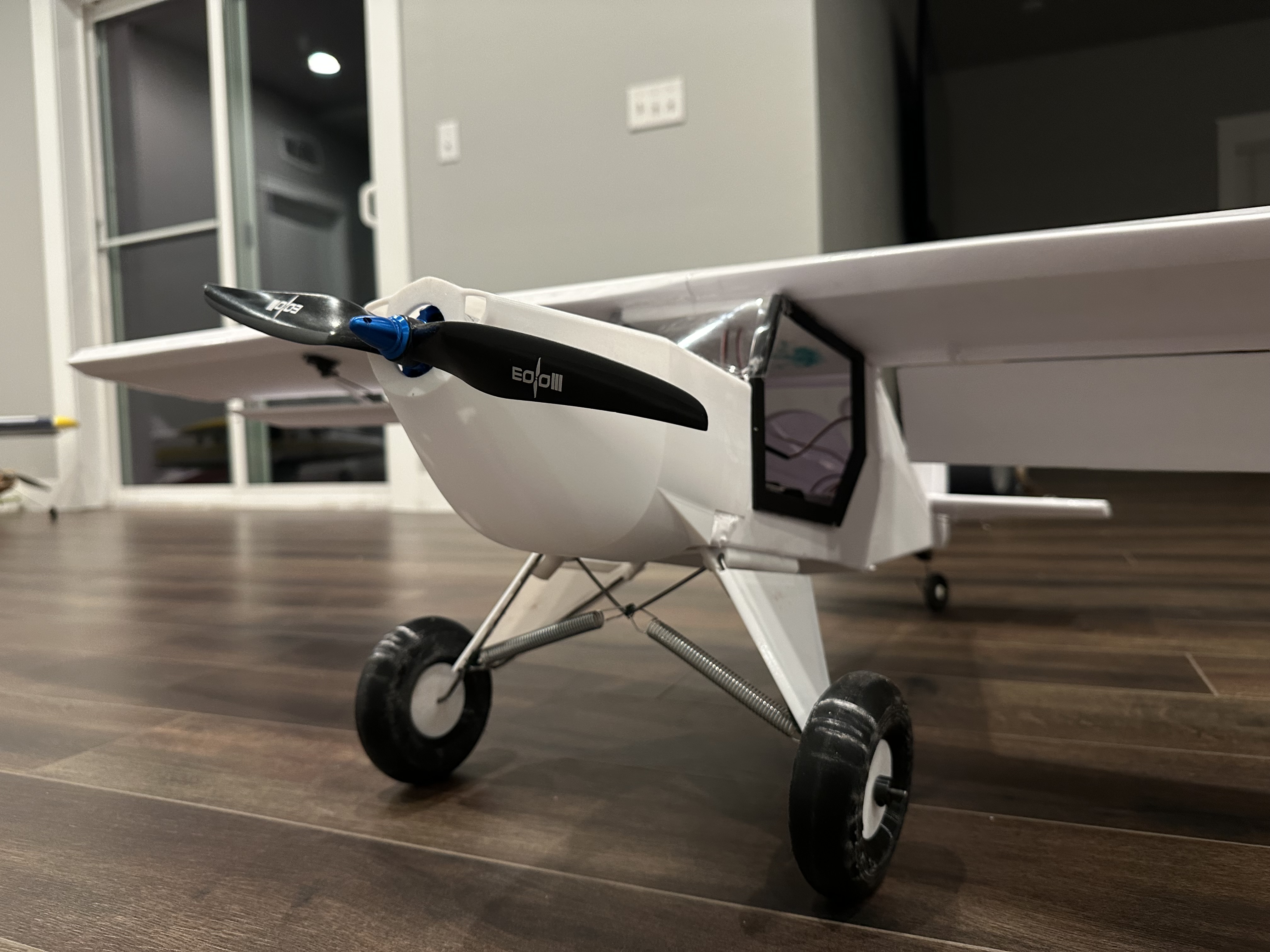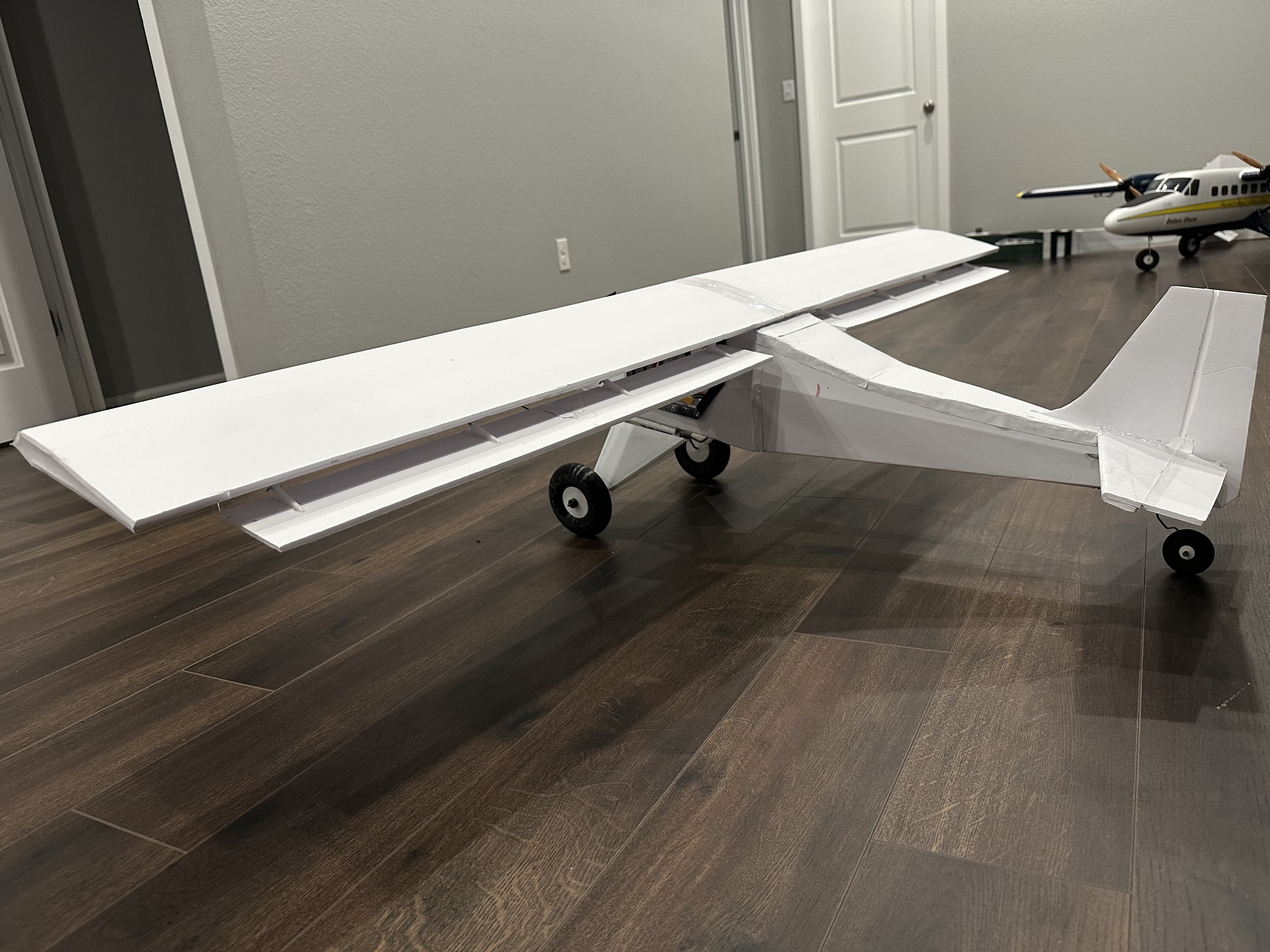 Most of my time went into refining the landing gear assembly. It took three prototypes to get it functioning just right, and the breakthrough came when I found springs with the perfect length and pull weight. For a 1500mm foamie, it was surprisingly efficient on materials—just four sheets of DTFB. Each wing used one sheet, while the fuselage, horizontal stab, and vertical stab took up the other two.