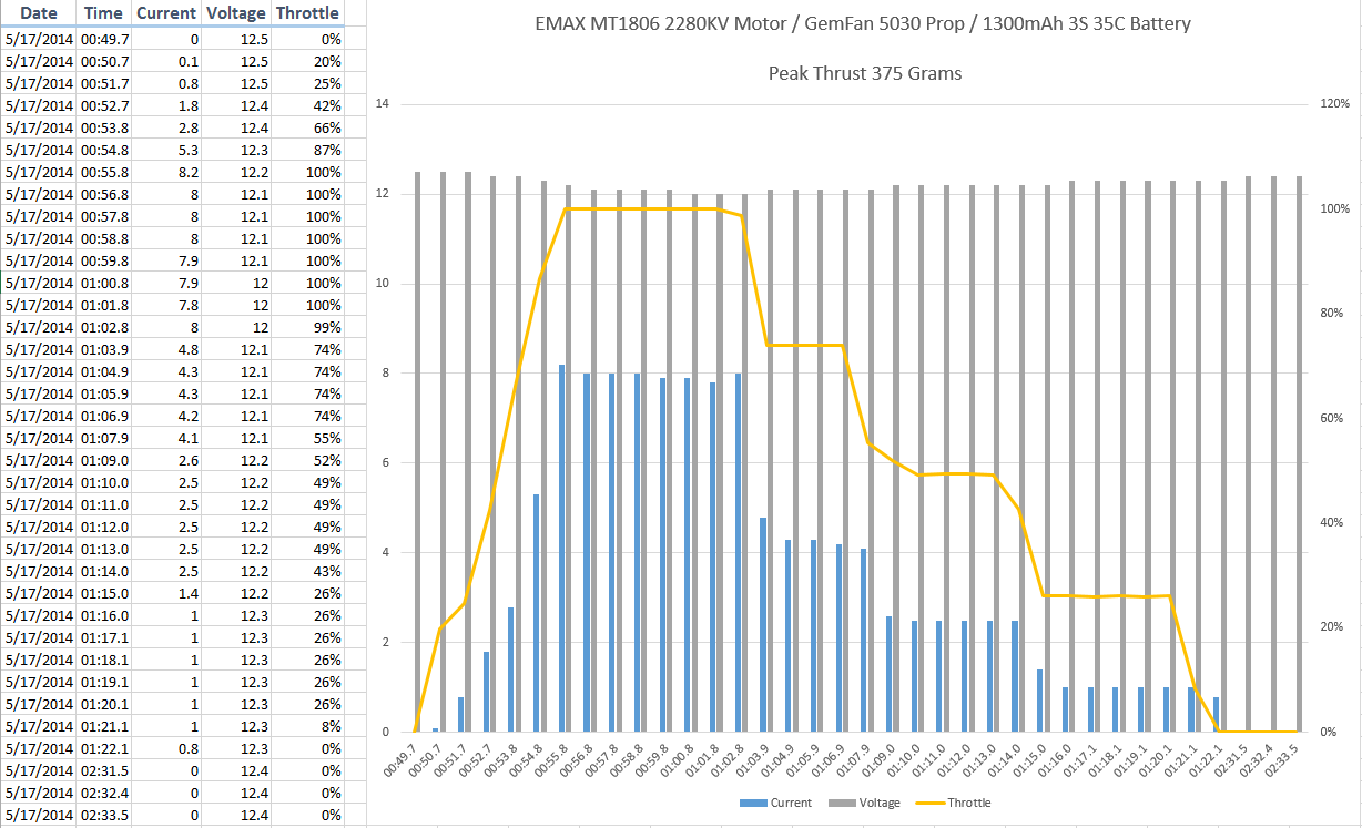 First up is a GemFan 5030 Nylon prop. 375 Grams of static thrust, pulling 8 amps, at wide open throttle.