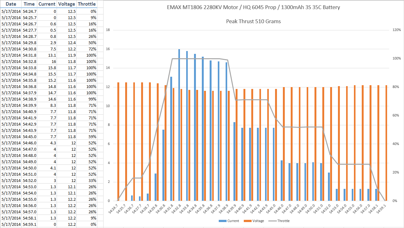 So some very impressive numbers all around. I found it most interesting how the 6045 prop didn't pick up much extra static thrust versus the 6030 prop, but had almost another 50% of current consumption. I think the more aggressive pitch is more efficient, more thrust, while on the move and that is where its performance benefit will be observed. Regardless, I am not sure it is good to run the 6045 prop on 12A ESCs if you plan on hot rodding around at near wide open throttle for more than a few seconds at a time (and with a cool down period). More food for thought: four of these would pull 64 amps of current; it is hard to find 1A - 1.3A batteries over 35C, so take that into consideration when you're picking the motor and prop combination to run.