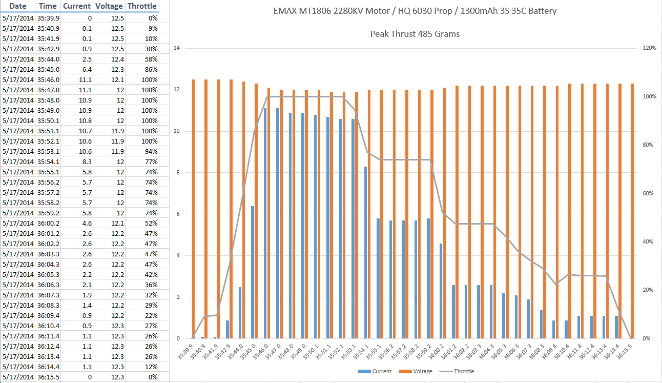 Second up is a HQ 6030 Carbon Filled prop. 485 Grams of static thrust, pulling 11 amps, at wide open throttle.