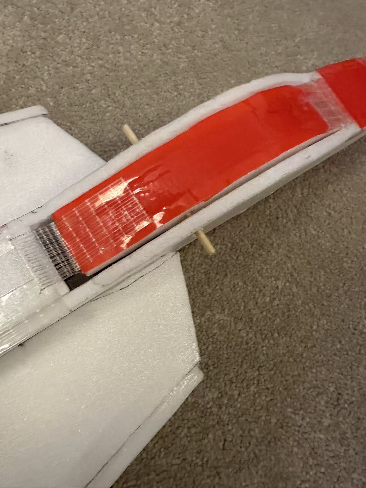 During the maiden, the plane went down at the groud after take off, at a lucky angle so it only resulted in a hard landing and a bit of the nose coming loose. Very quick fix did the job and it ready for next weekend's flight. (The pics are of it after the fix lol the crash did not change a thing) The crash turned out to be a wrong connection, since i put the left servo in channel 2 in stead of 1 and vice versa, reversing the elevator (it was about to be dark so in the hurry i forgot to check....never again...)