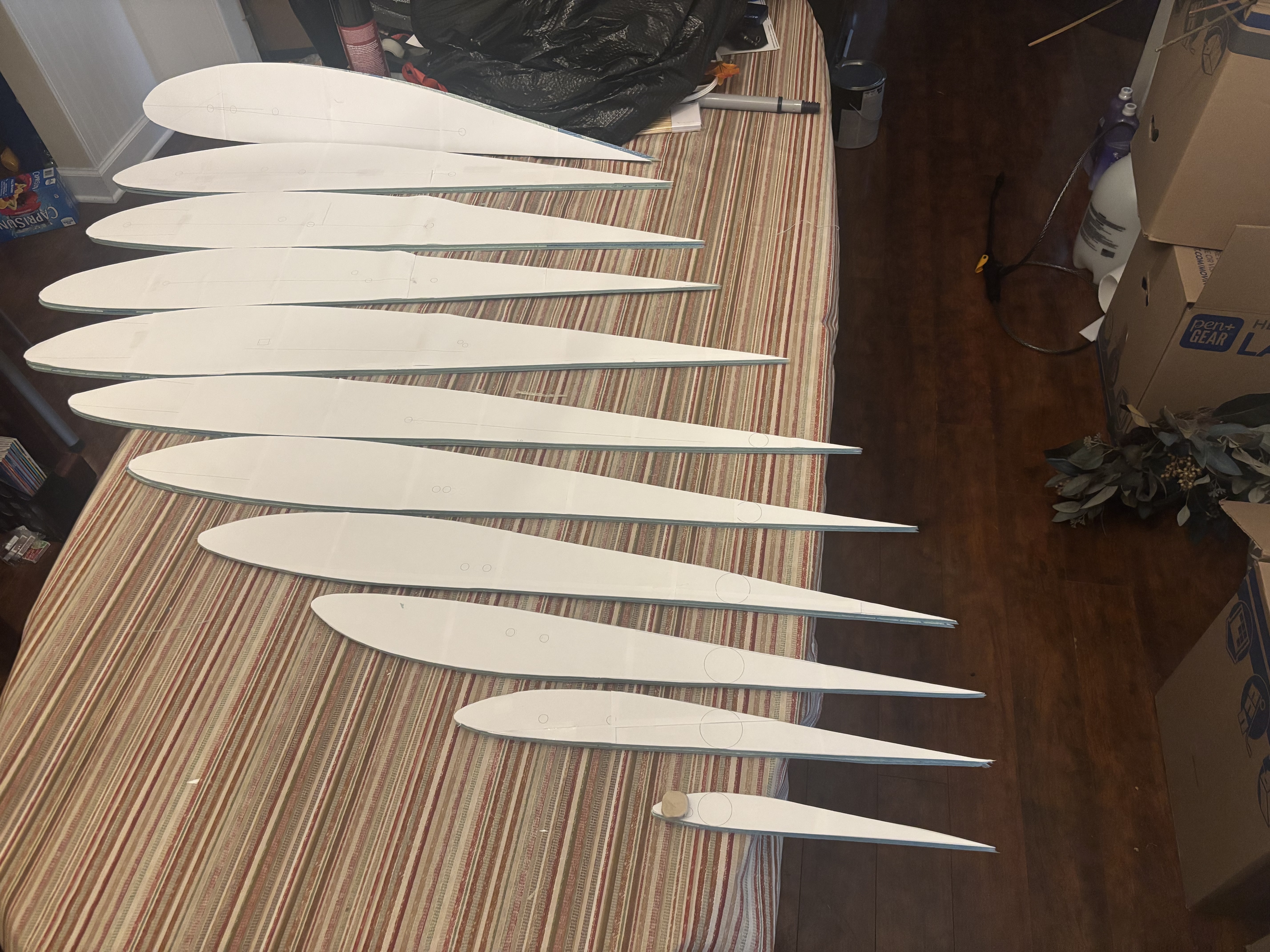 I want to make a balsa style replica, sized to be about 14’ WS. That will make the wing chord around 48”. The original relies in Carbon Fiber tubes to joint the wings halves together.