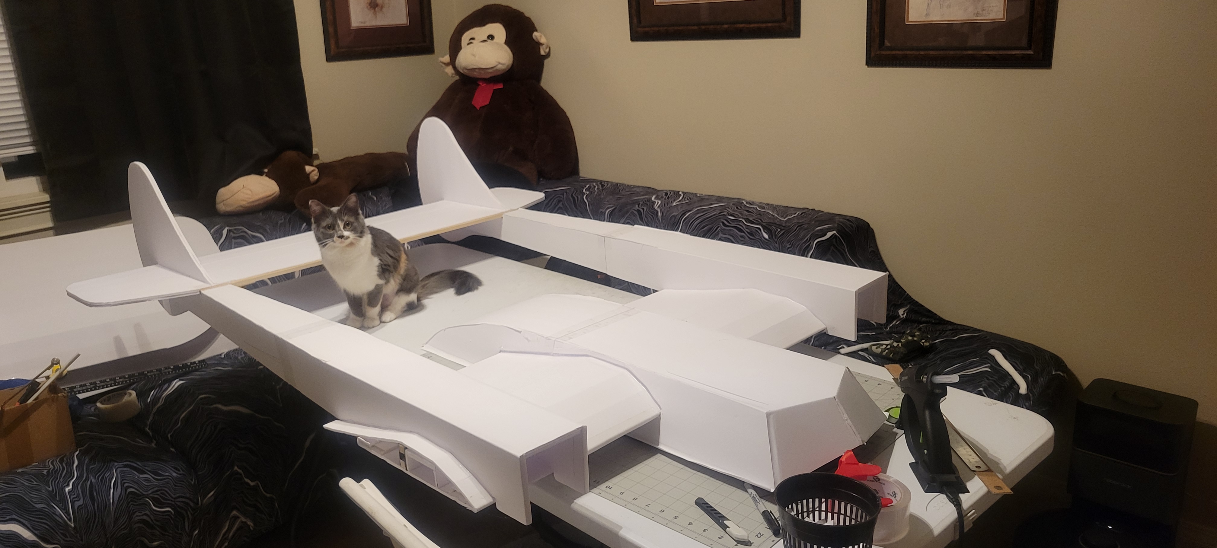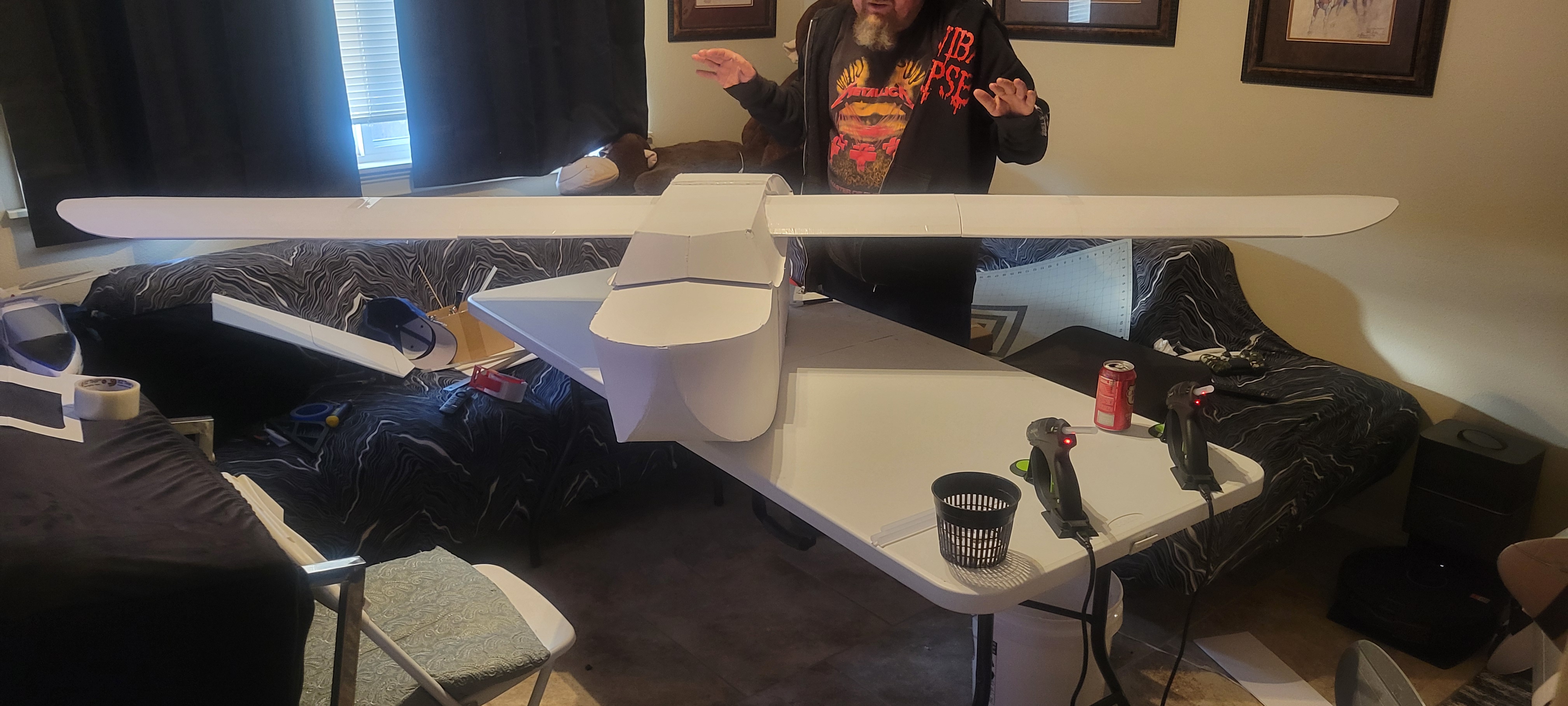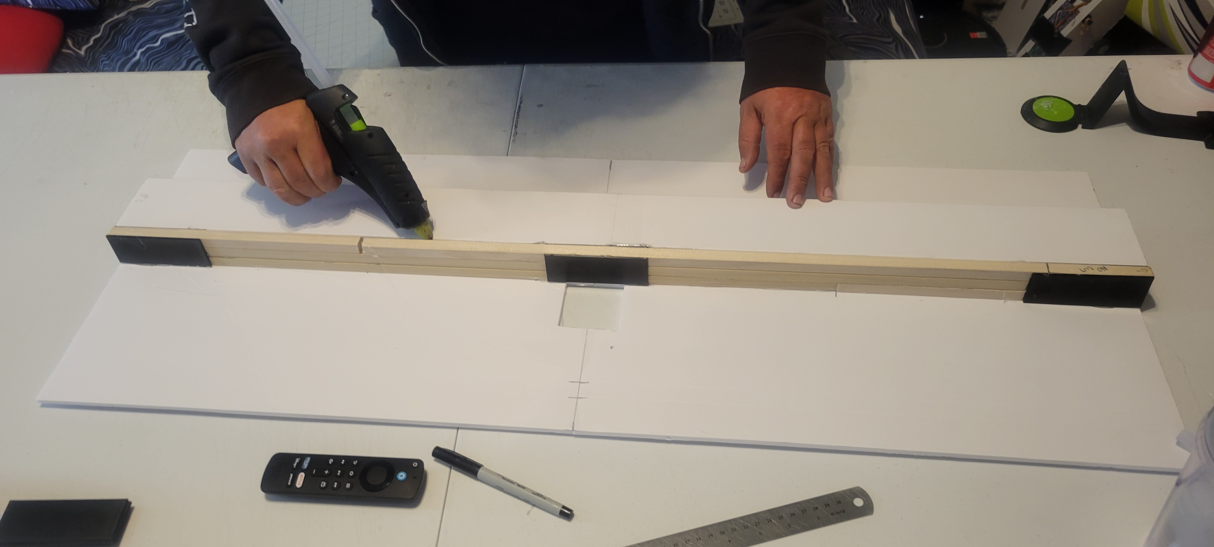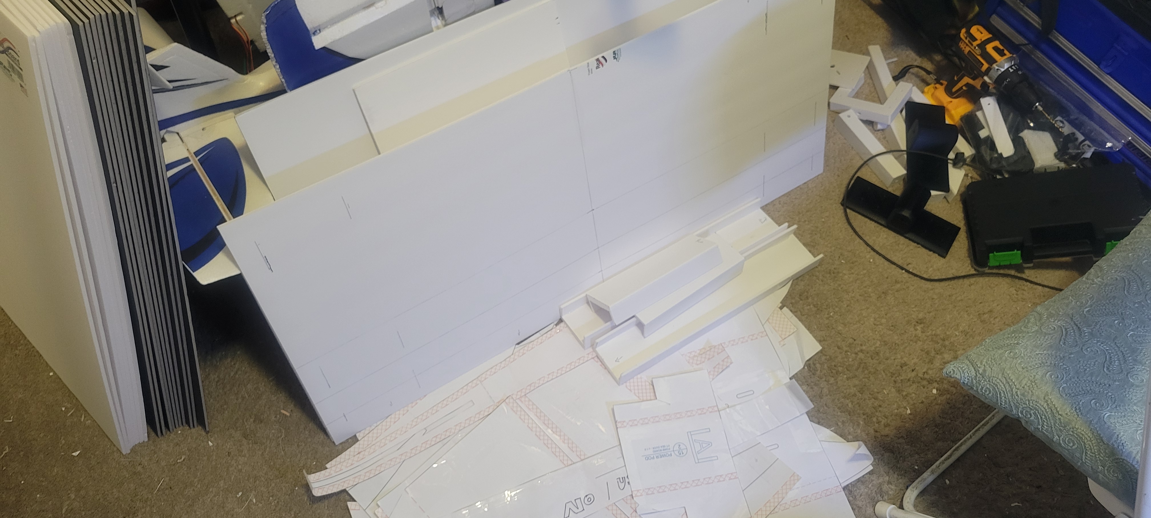 Got the wing cut out and started. Didn't finish it cause I want to give some more thought into strength, and how to connect the three pieces. So went on to build the two tail booms. Since I'm out of foam until 1st of December, gonna make the wiring and build a thrust stand. Pretty smooth going so far (knock on wood).