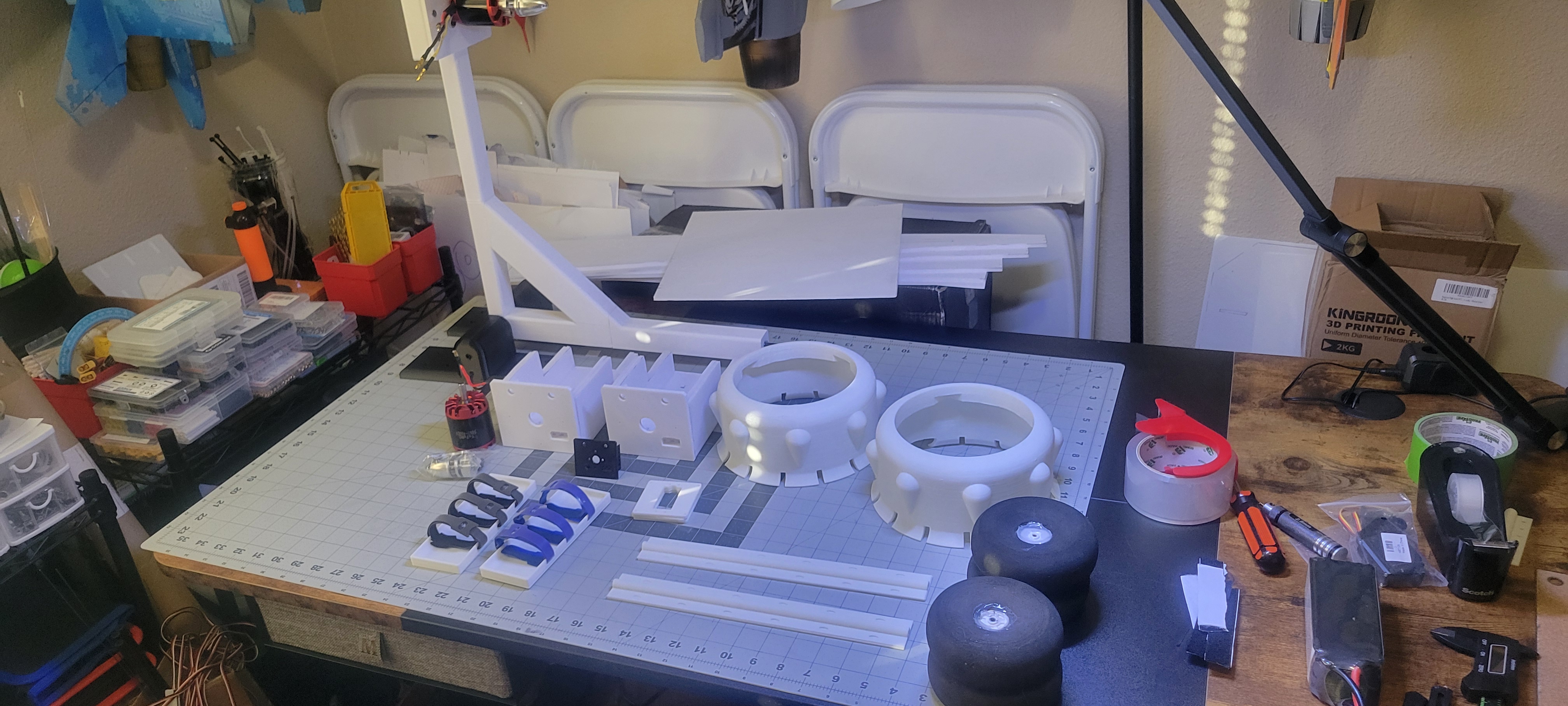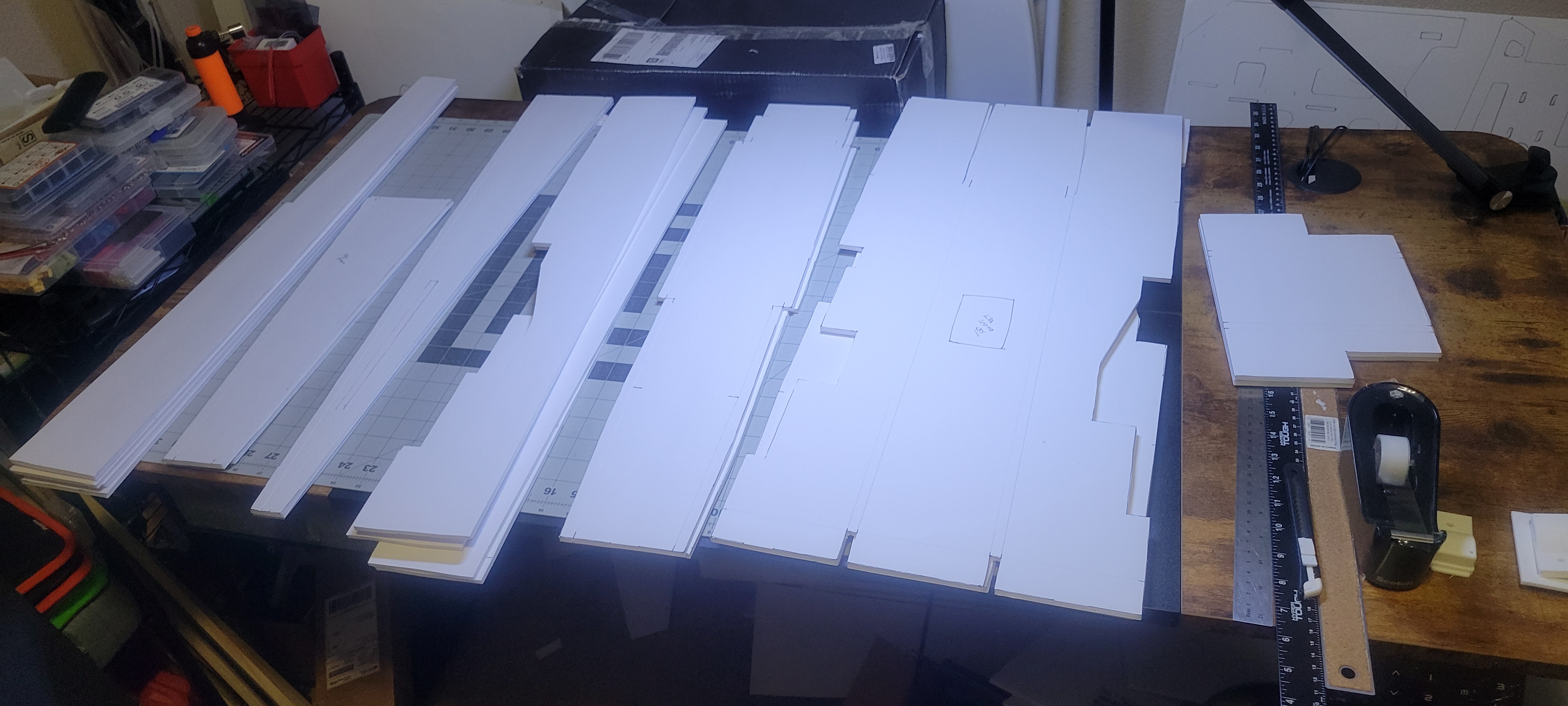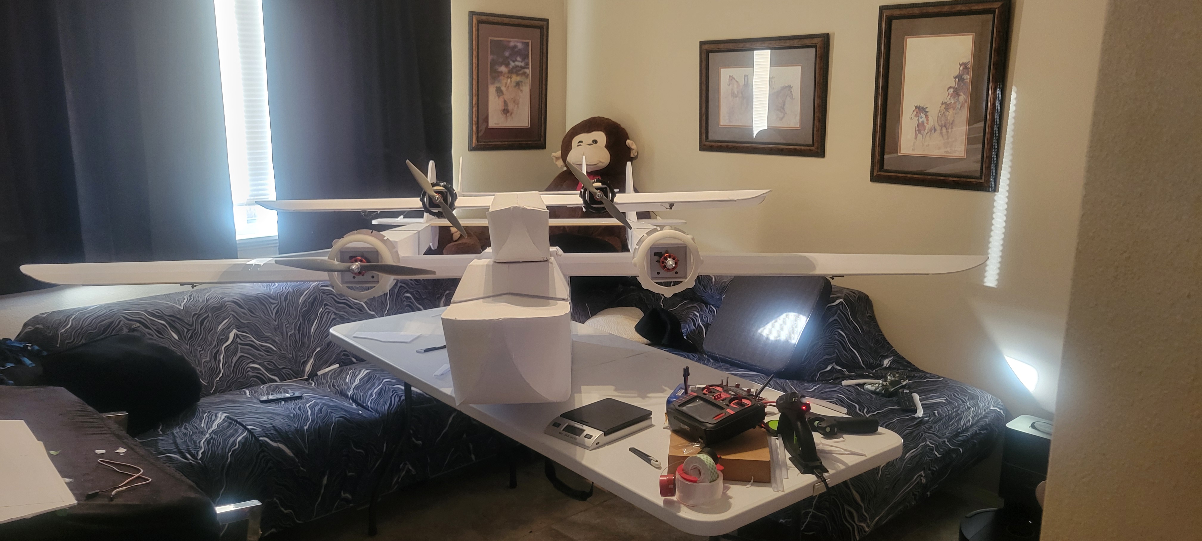 Got the wing cut out and started. Didn't finish it cause I want to give some more thought into strength, and how to connect the three pieces. So went on to build the two tail booms. Since I'm out of foam until 1st of December, gonna make the wiring and build a thrust stand. Pretty smooth going so far (knock on wood).
