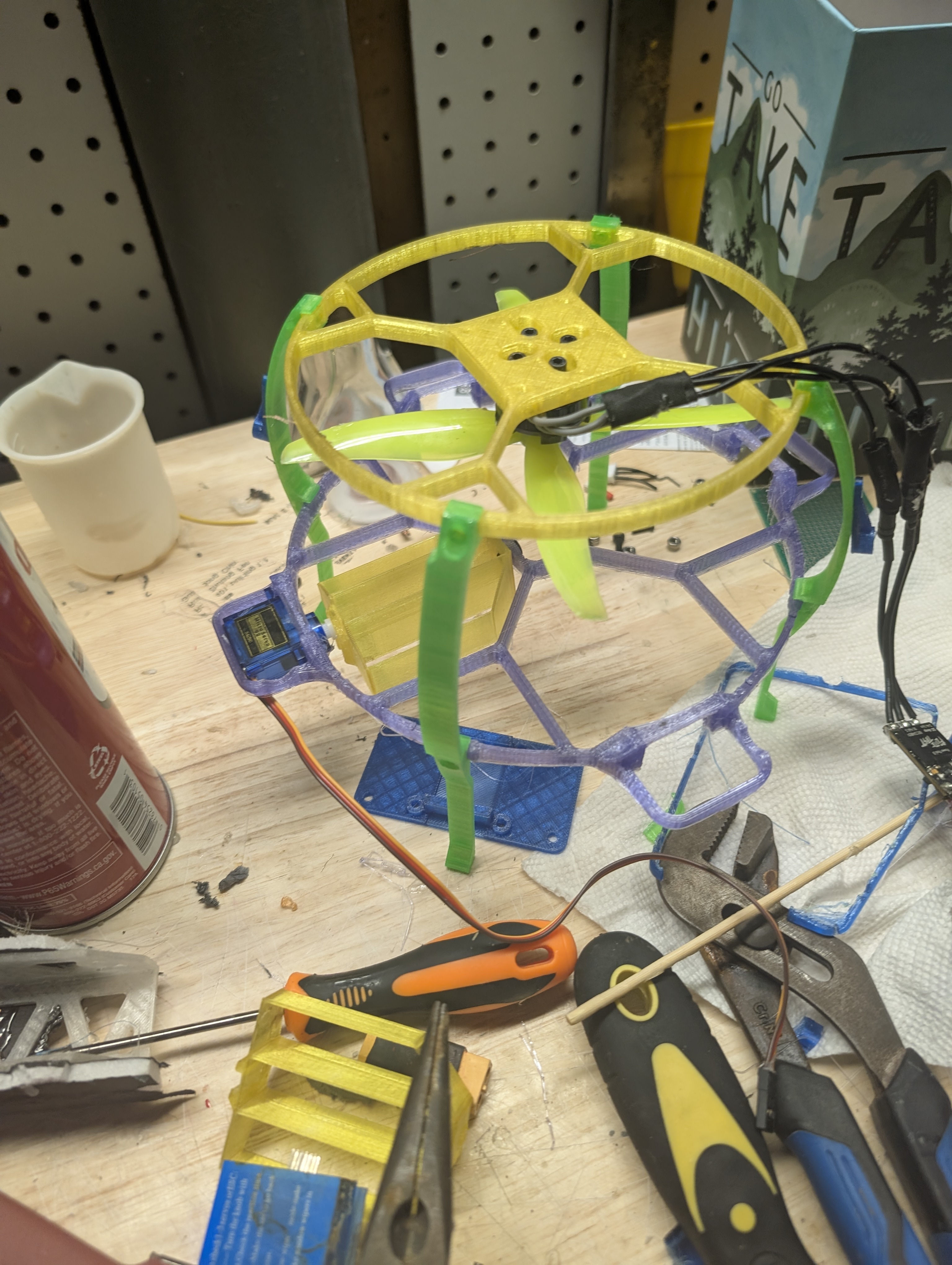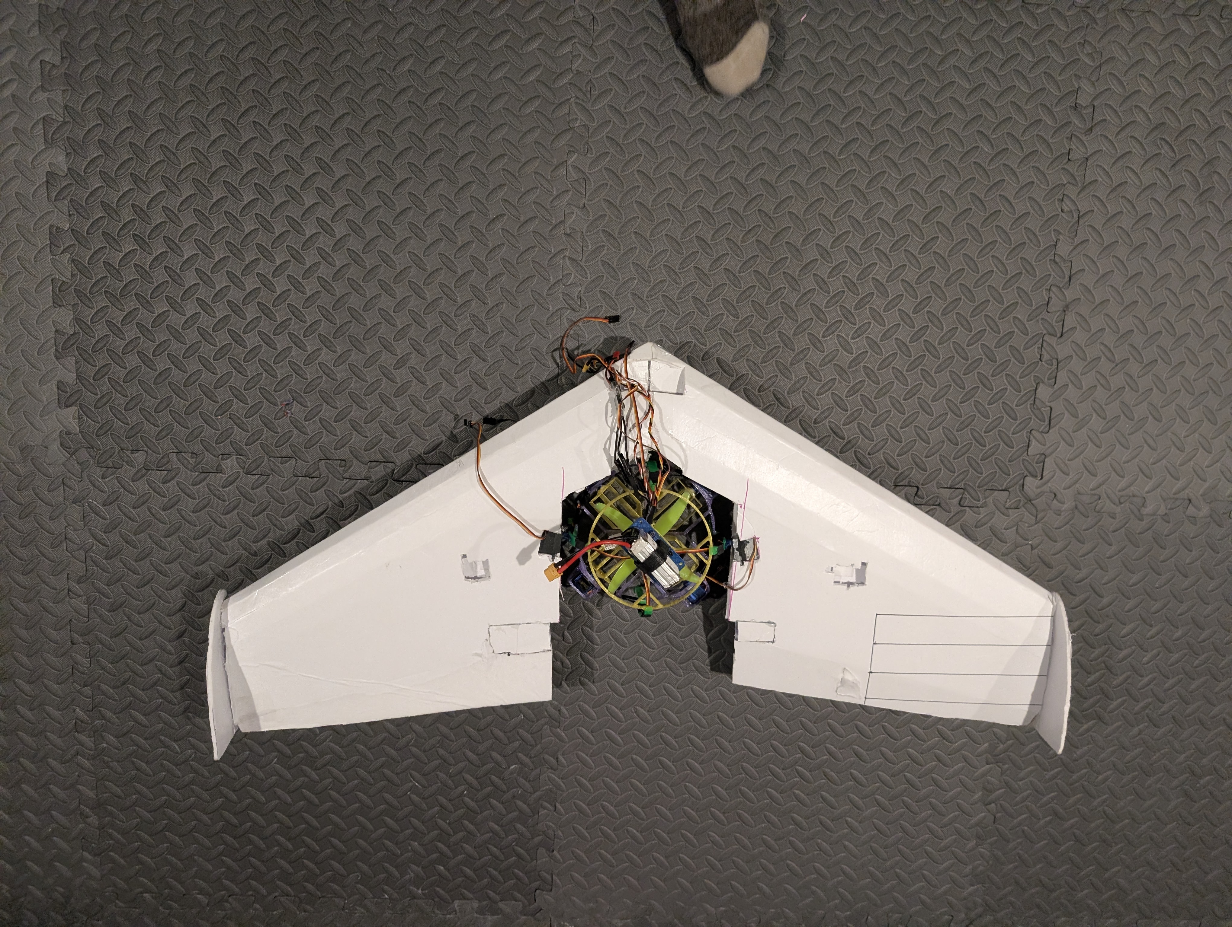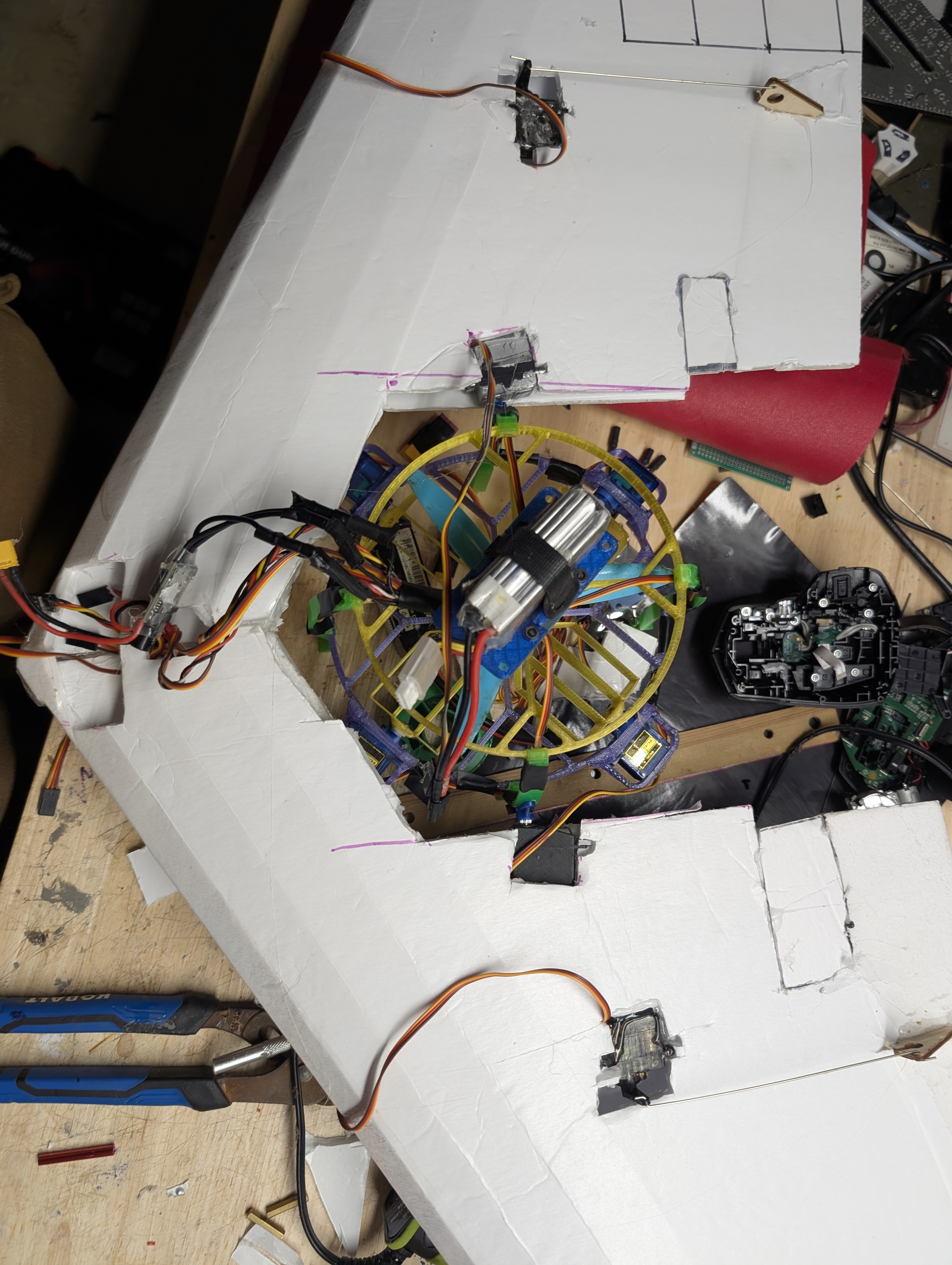I decided that building a normal VTOL was not enough, I wanted to build one that worked on a single engine. My Boomin Flerken VTOL made recently was a huge success but I noticed the wing slowly failing from the added stress of VTOL motors, and the airframe just generally wasn't the best for the job. I decided that I would like to build a successor so here it goes. This is a build log of my VTOL singlecopter FT Versa. (I made it the versa just because it was a simple airframe that I had on hand with no electronics. I will be reinforcing the airframe with added spars, and using the ball drone mk2 for the single copter. It is 3d printed, runs off of a quad motor on a 4 blade 6" prop and 4 sg90s to control the bottom vanes. Attached are some pictures of it. For a flight controller I don't want to use INAV, but I instead will use Madflight, an esp32 code based flight controller software, no gui. I made some modifications for it to work as a VTOL, and so the parts arrive tomorrow, we will test it out.