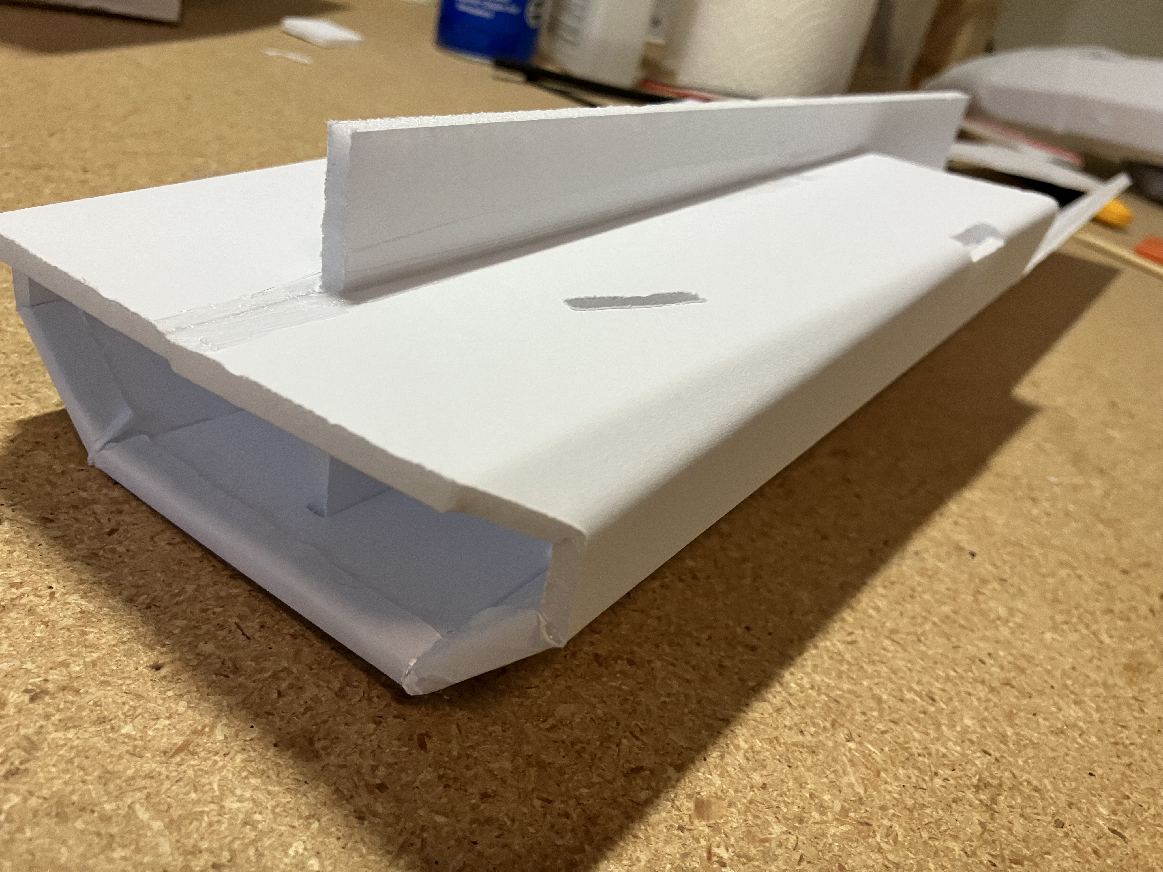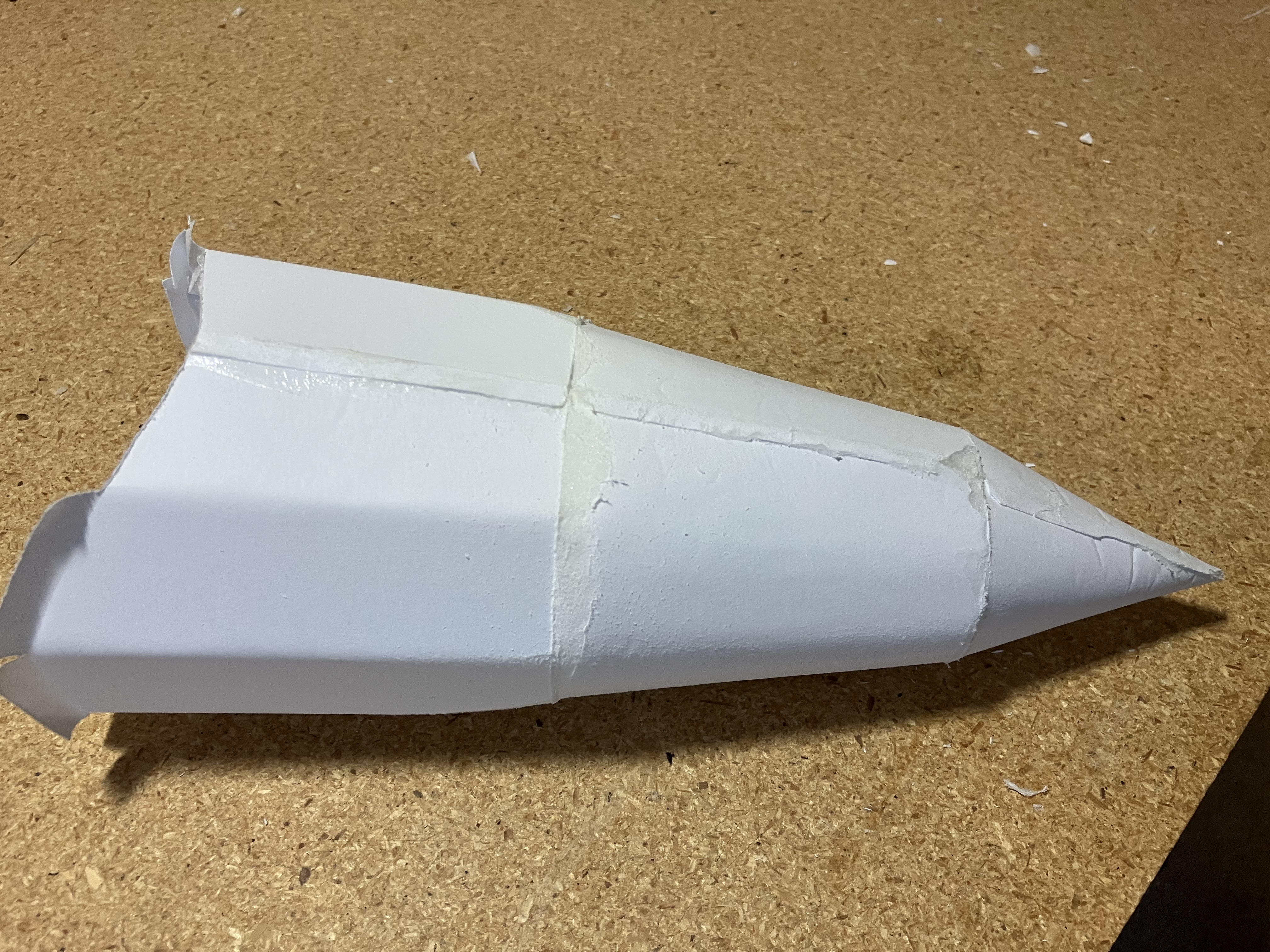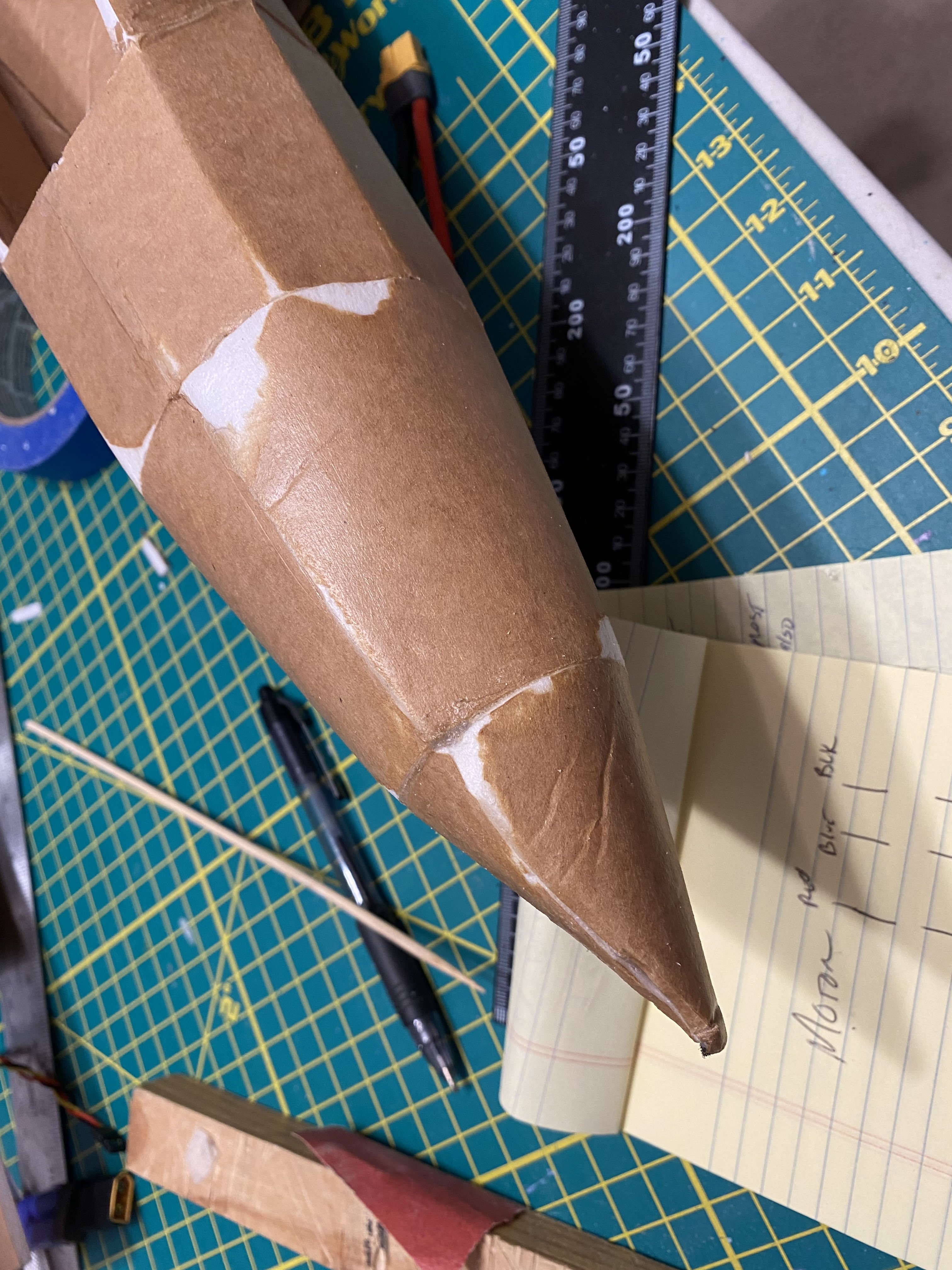 I actually worked on this section because I had the EDF. I used card stock and duct tape. I had to make it wider to fit around my EDF. The first one I cut out by the plan would not wrap all the way around. So make a “practice” thrust tube out of regular printer paper and use that as your template.Now the next step is to glue the forebody/nose section to the intake, but I will hold off as I might re-build the nose section as I am not happy with the joins.
